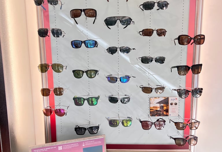 En verres solaires, nous faisons surtout des verres polarisés. Nous sommes particulièrement fières de proposer la marque d'excellence Maui Jim, en verres correcteurs et non correcteurs, pour un confort visuel absolu sous le soleil.